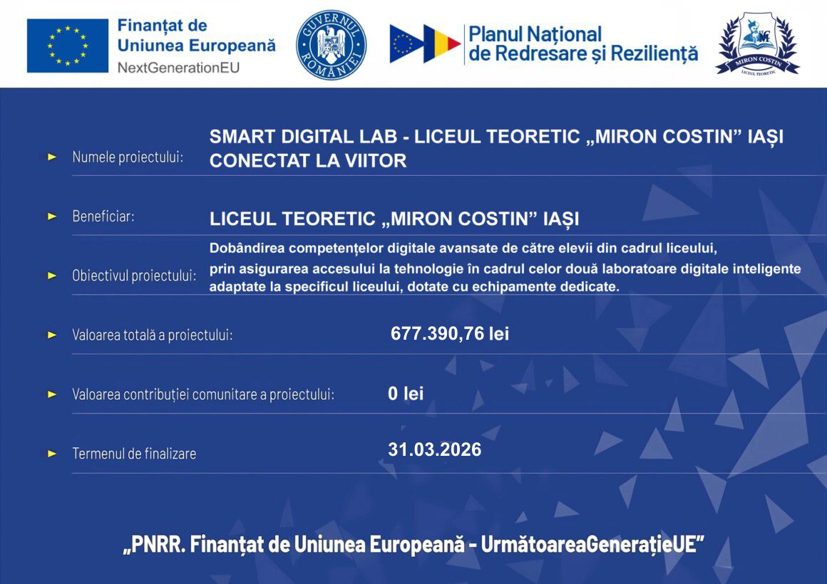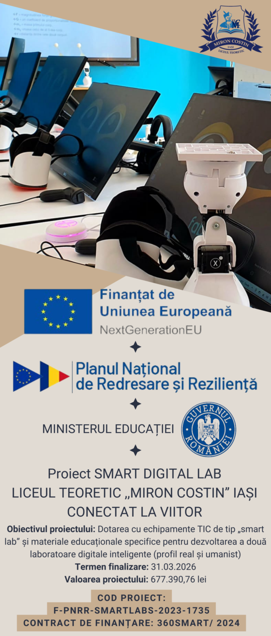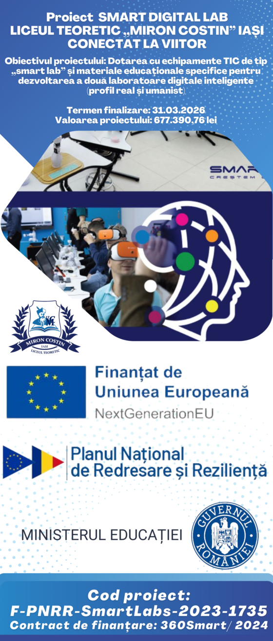 Începând cu data de 8.01.2024, Liceul Teoretic ”Miron Costin” Iași este beneficiarul proiectului Smart Digital Lab – Liceul Teoretic ”Miron Costin” Iași conectat la viitor (cod proiect: F-PNRR-SMARTLABS-2023-1735), al cărui obiectiv este dotarea cu echipamente TIC de tip ”smart lab” și cu materiale educaționale specifice pentru dezvoltarea a două laboratoare digitale inteligente dedicate elevilor profilului real, respectiv umanist.