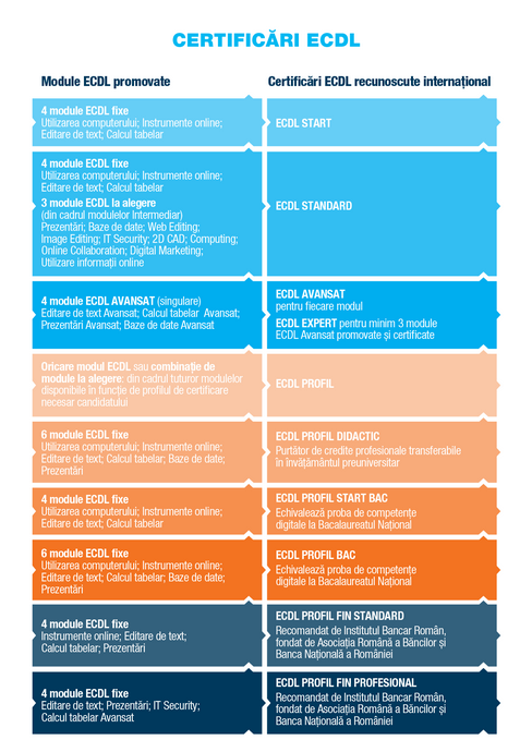 - Profil ECDL FIN PROFESIONAL: Editare text, Calcul tabelar Avansat, Prezentări şi IT Security.