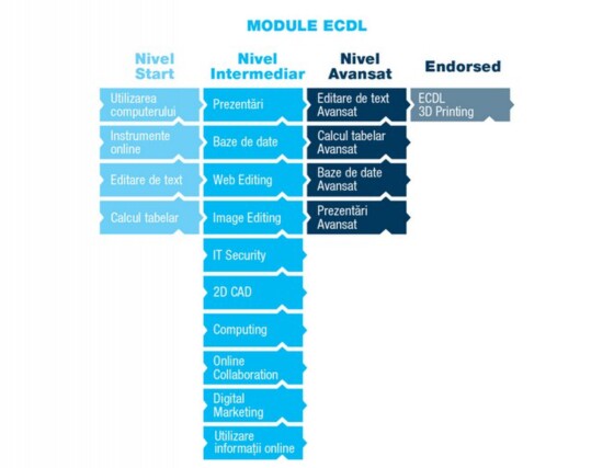 - Prezentări, Baze de date, IT Security, Web Editing, Image Editing, 2D CAD, Computing, Digital Marketing, Online Collaboration, Utilizare informaţii online.